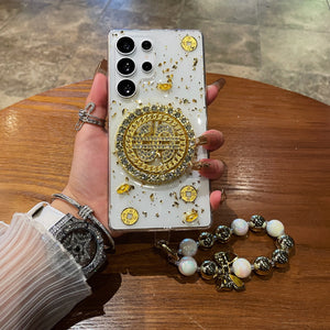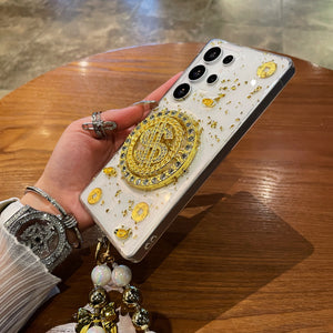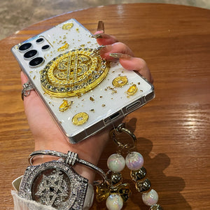 Luxury Rotating Dollar Case for Samsung Galaxy S25 Ultra | Gold Bling Coin Design with Beaded Wrist Strap
