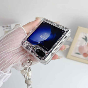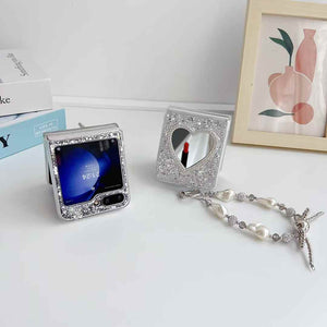 Turn heads wherever you go with this glittering heart mirror case designed for the Samsung Galaxy Z Flip 6. The case boasts a shimmering silver finish with embedded glitter and a heart-shaped mirror for on-the-go touch-ups. Paired with a stylish detachable strap adorned with pearls and crystals, this case is more than just protection – it’s a statement.