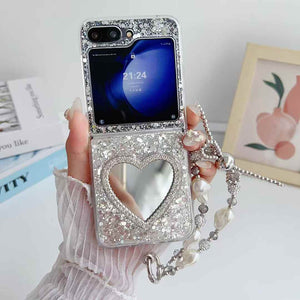 Heart Shape Mirror Glitter Phone Case with Beaded Strap for Samsung Galaxy Z Flip 6
