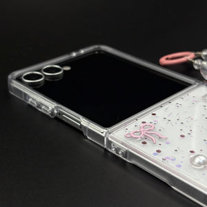 Samsung Galaxy Z Flip 7 Cute Pink Glitter Case with Pearl & Charm Strap | Protective Transparent Cover