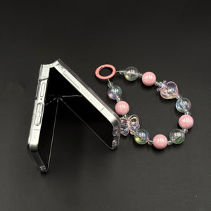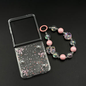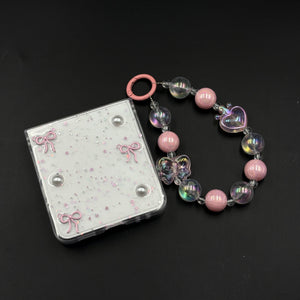 Add sparkle and style to your Galaxy Z Flip 7 with this cute glitter case featuring pearl accents, pink bow details, and a detachable beaded charm strap. A perfect blend of protection, fashion, and functionality for your foldable phone.