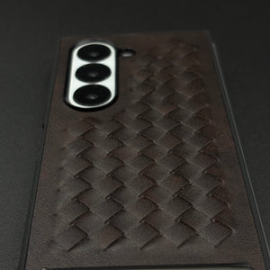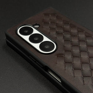 Elevate your Samsung Galaxy Z Fold 6 with this luxurious leather-feel case, crafted for those who appreciate both style and substance. The sophisticated woven grid texture delivers a premium hand feel, while the built-in metal kickstand adds daily convenience for media viewing and calls.