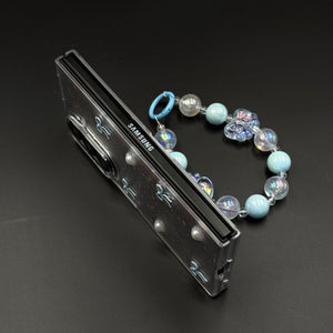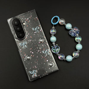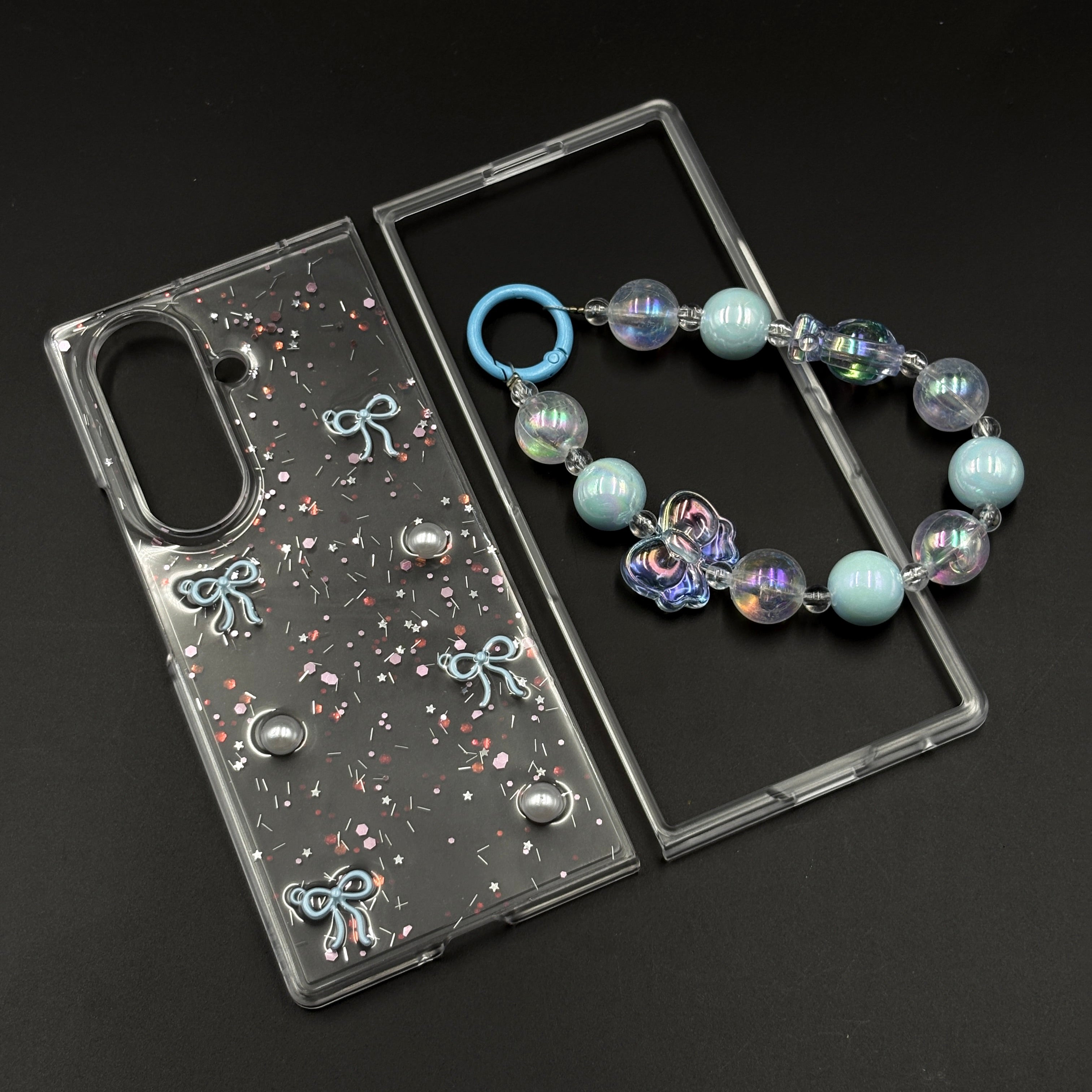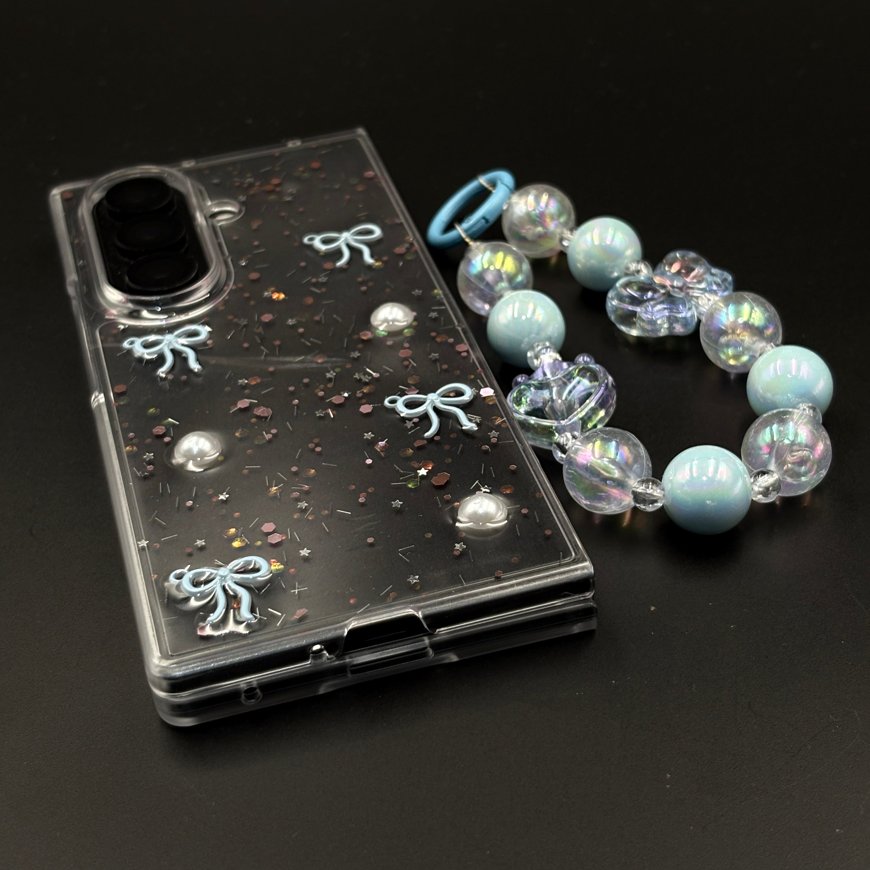 Add sparkle and style to your Galaxy Z Fold 7 with this cute glitter case featuring pearl accents, blue bow details, and a detachable beaded charm strap. A perfect blend of protection, fashion, and functionality for your foldable phone.