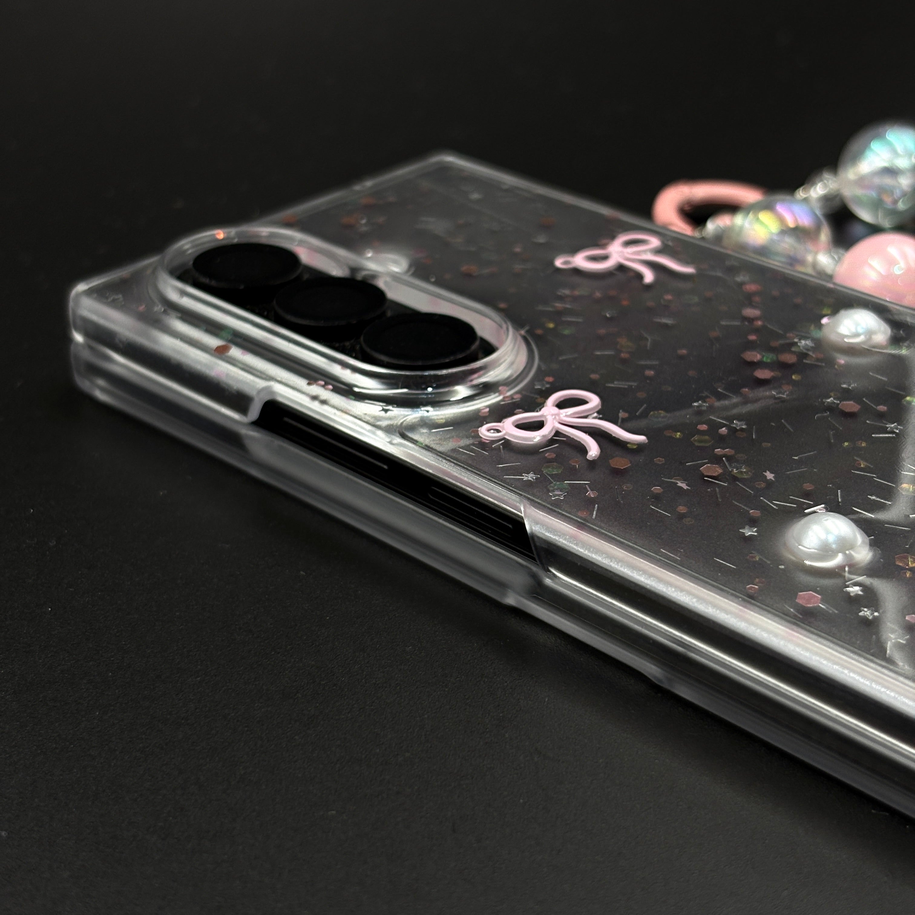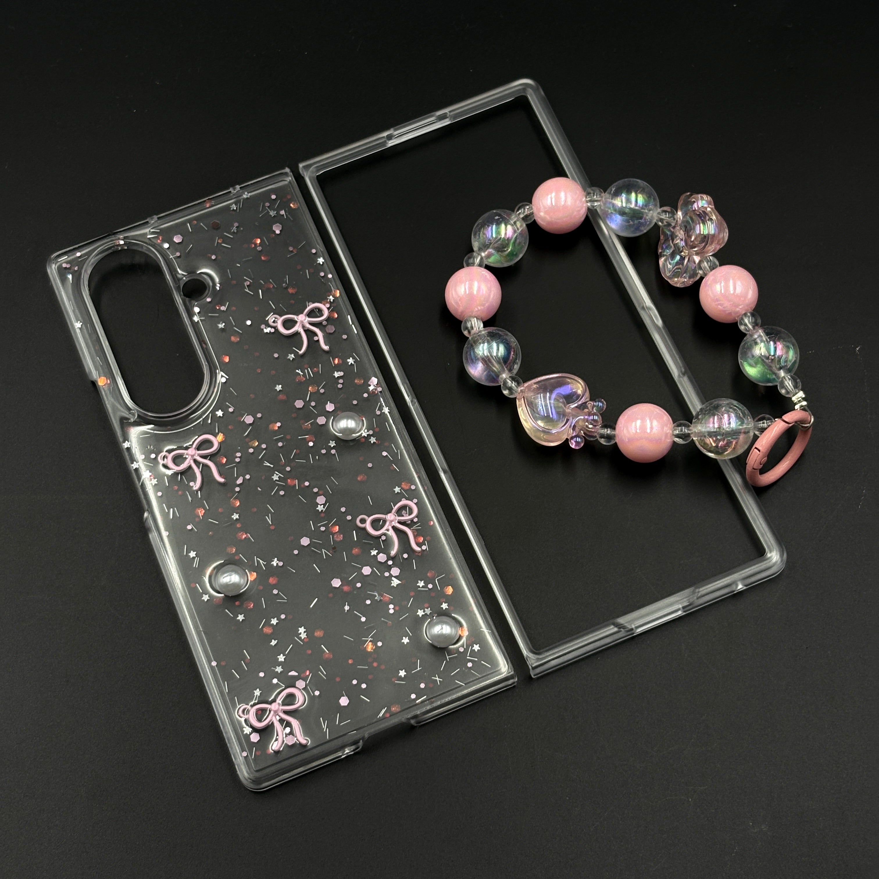 Add sparkle and style to your Galaxy Z Fold 7 with this cute glitter case featuring pearl accents, pink bow details, and a detachable beaded charm strap. A perfect blend of protection, fashion, and functionality for your foldable phone.