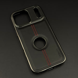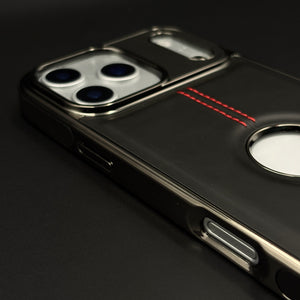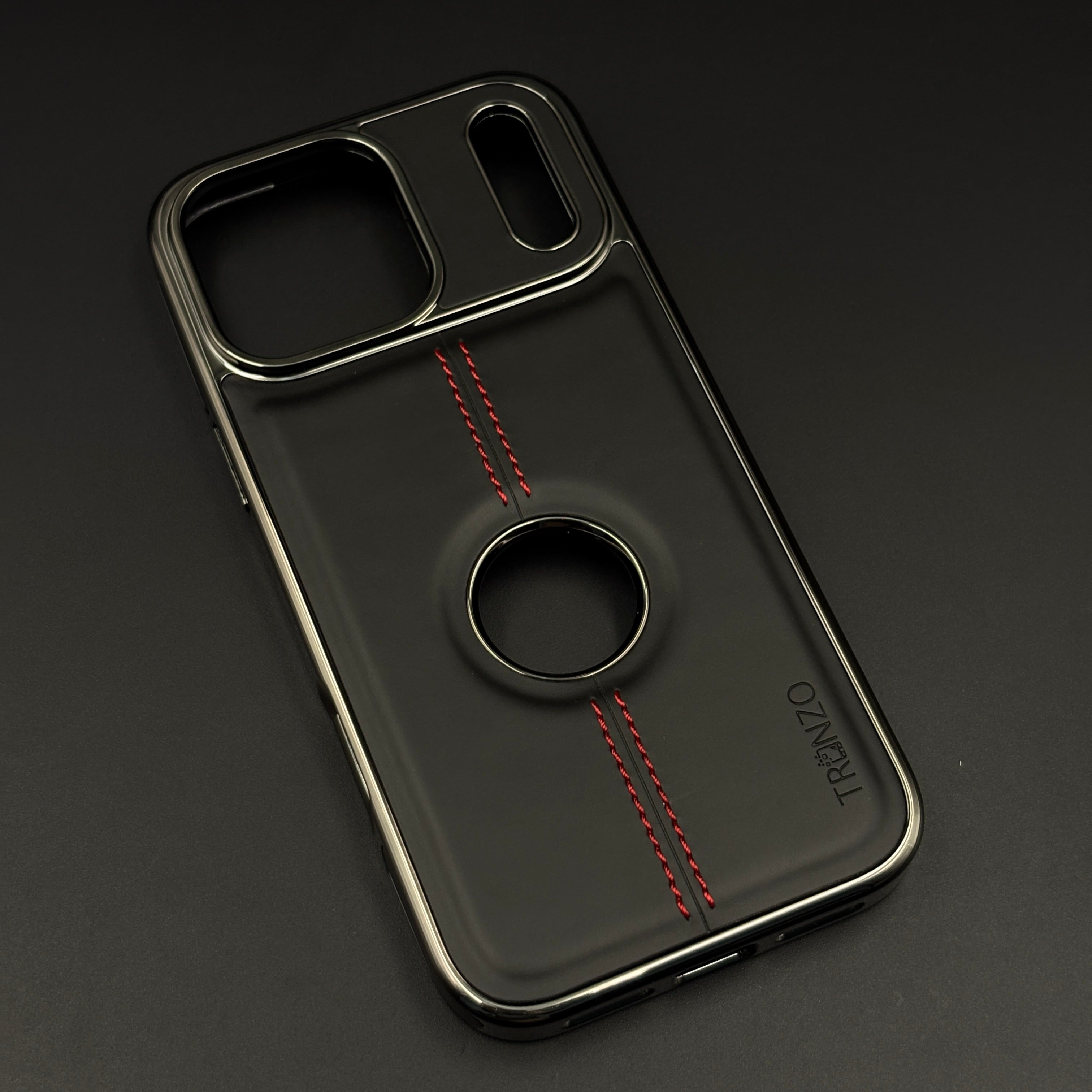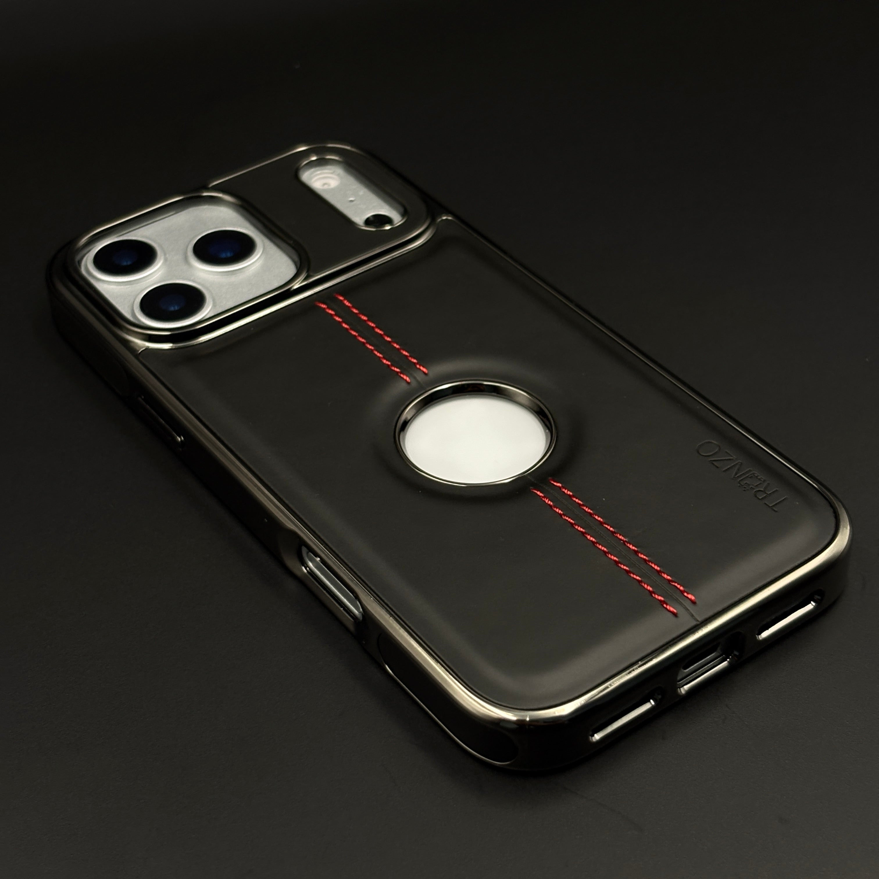 Give your iPhone 17 Series a luxury automotive-inspired look with this stitch leather chrome case, featuring dual red contrast stitching, metallic chrome camera frame, and centered logo cut-out.