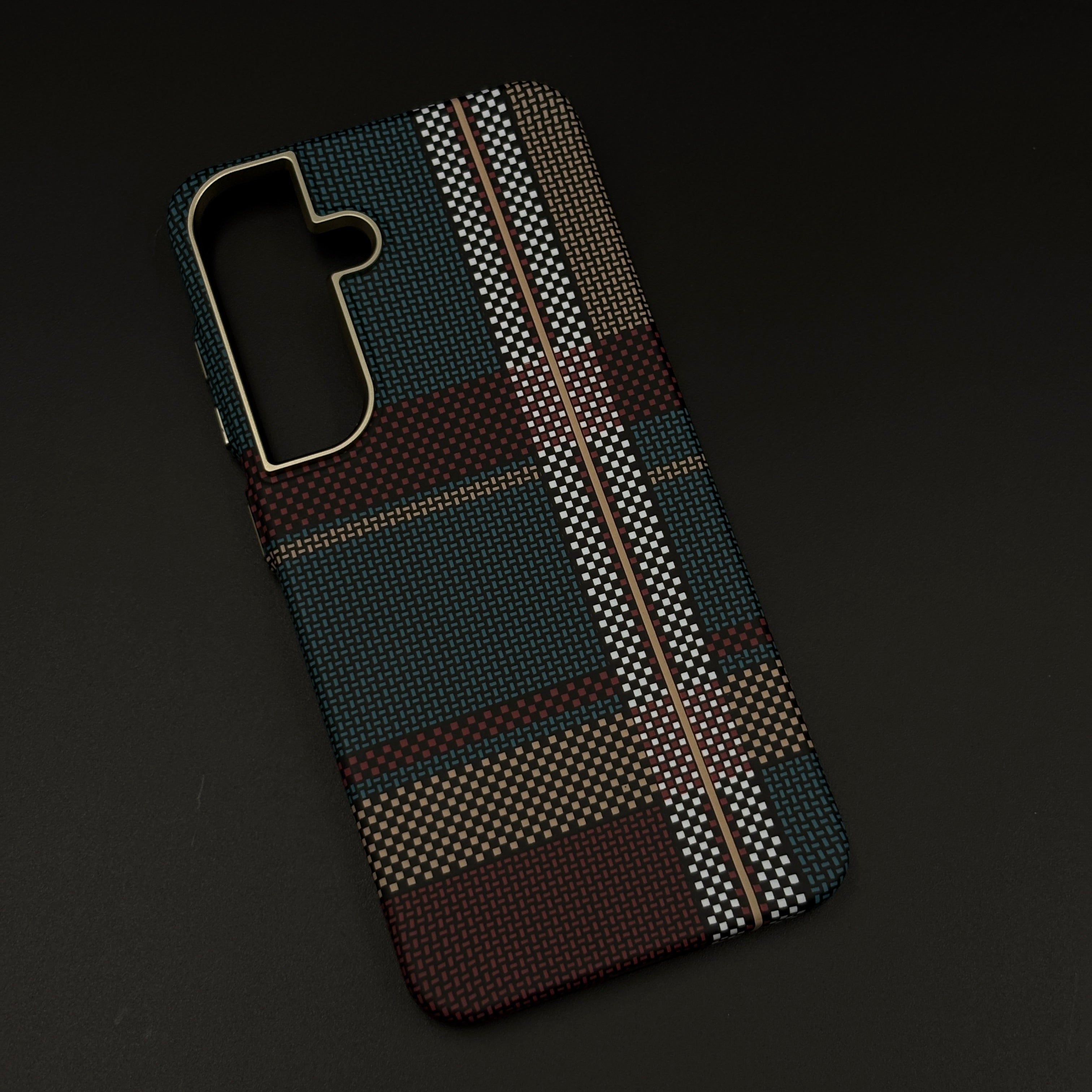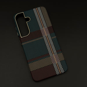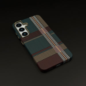Refresh your Galaxy S24 | S25 with this teal and burgundy plaid aramid case—featuring a rare carbon fibre weave, rugged ultra-light build, and a concealed MagSafe ring for effortless wireless charging.