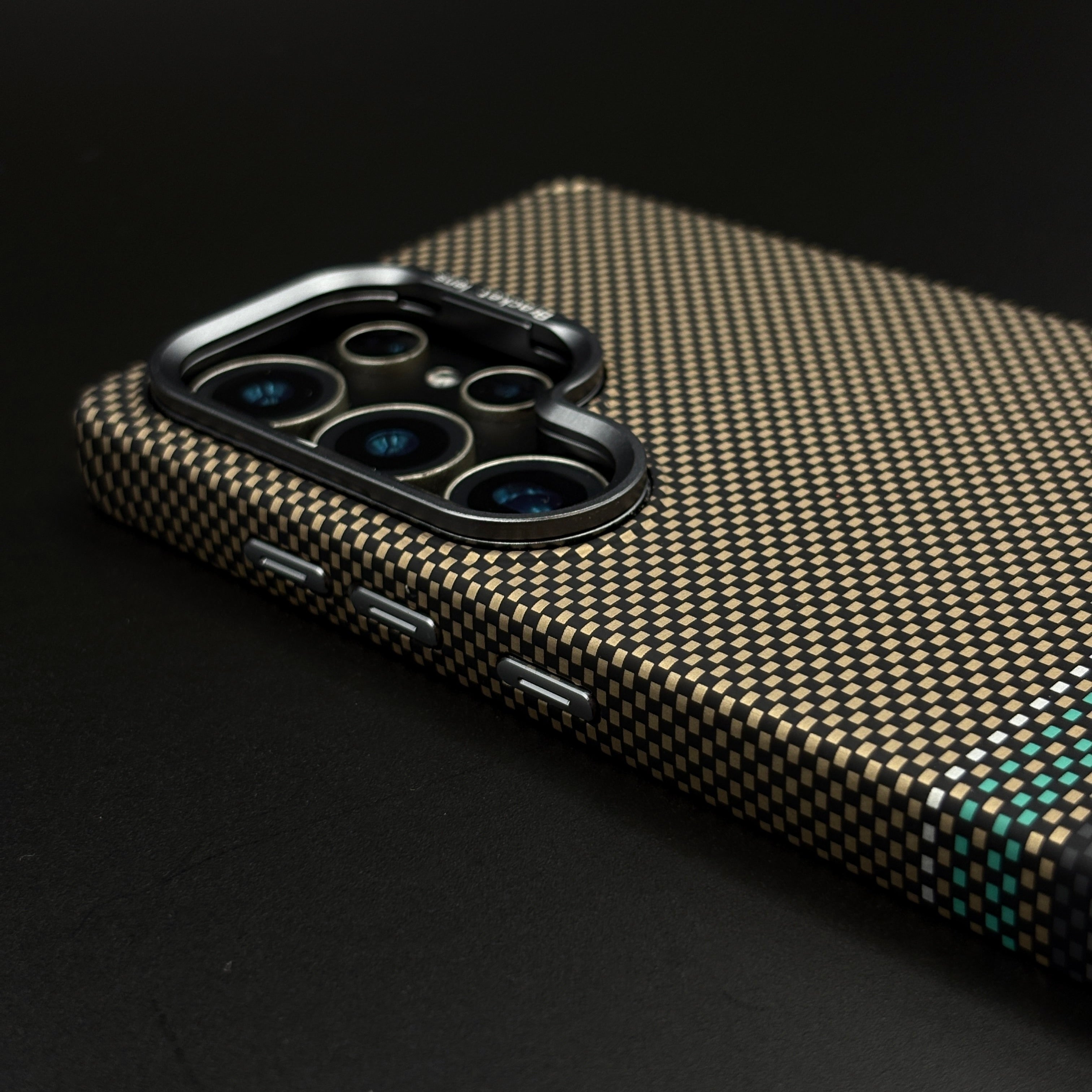 Elevate your Samsung Galaxy S23 Ultra’s style and utility with this Two-Tone Aramid Case, combining a sophisticated beige and black design with a realistic carbon fibre feel. This premium case features a built-in camera kickstand for hands-free use and hidden MagSafe functionality for seamless wireless charging and accessory attachment.