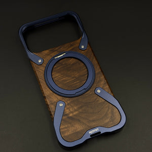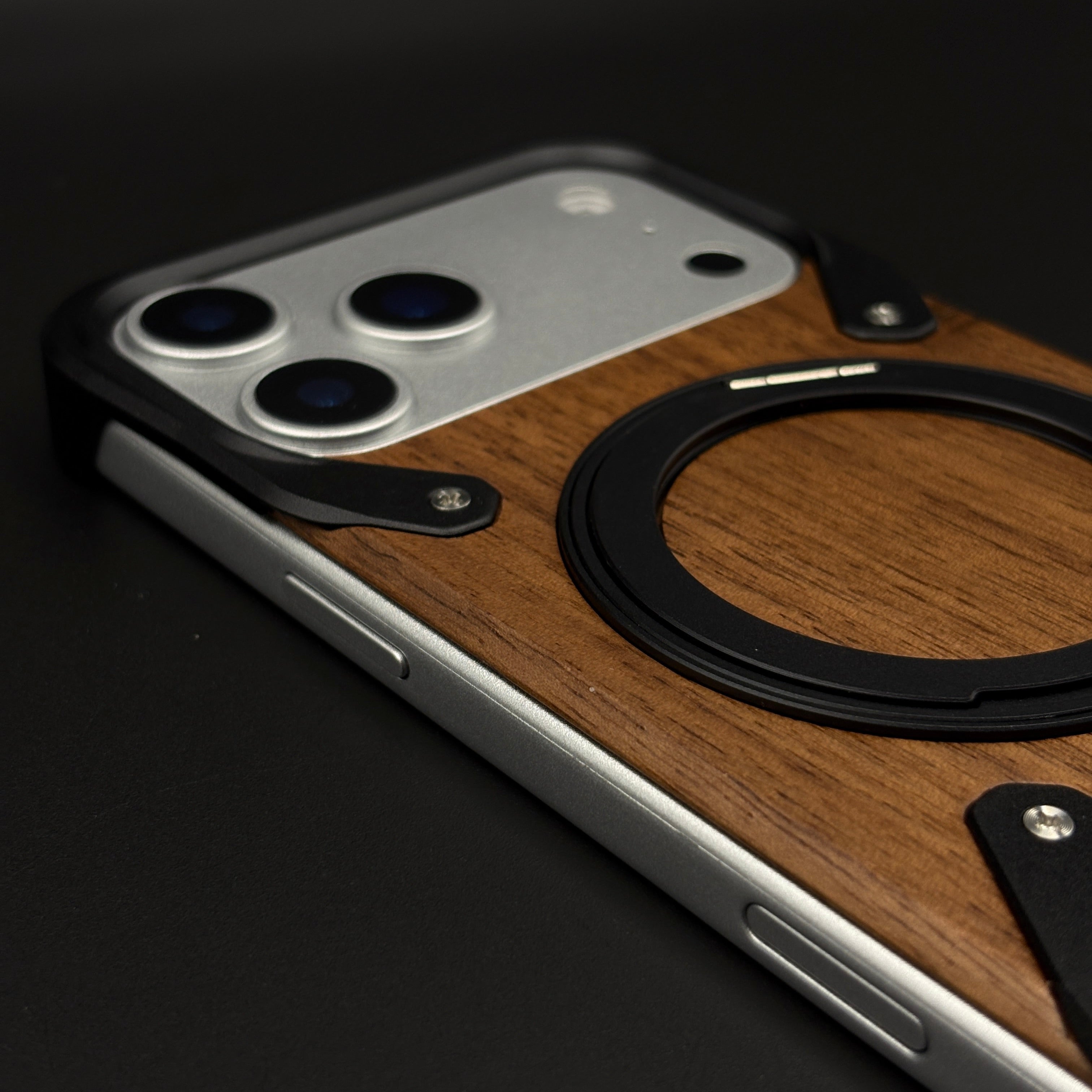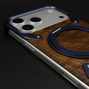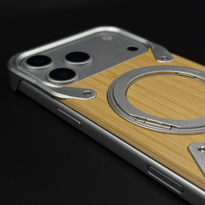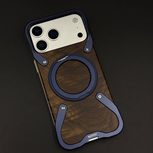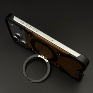 Wood Grain Metal Ring Stand Mobile Case Cover for iPhone 17 Series | Magnetic Kickstand Protection